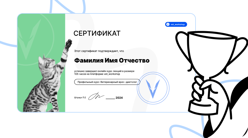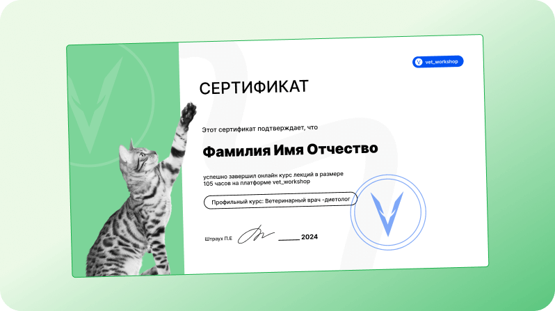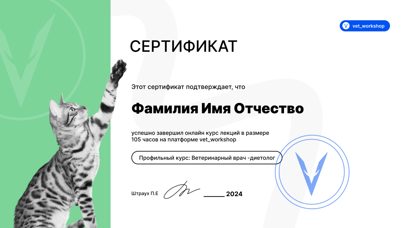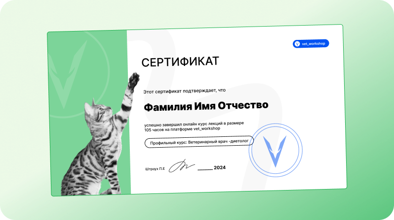 После завершения курса и успешного прохождения тестирования, вы получите электронный сертификат, подтверждающий успешное окончание курса "Ветеринарный врач-диетолог", усвоение материала и успешное завершение обучения.