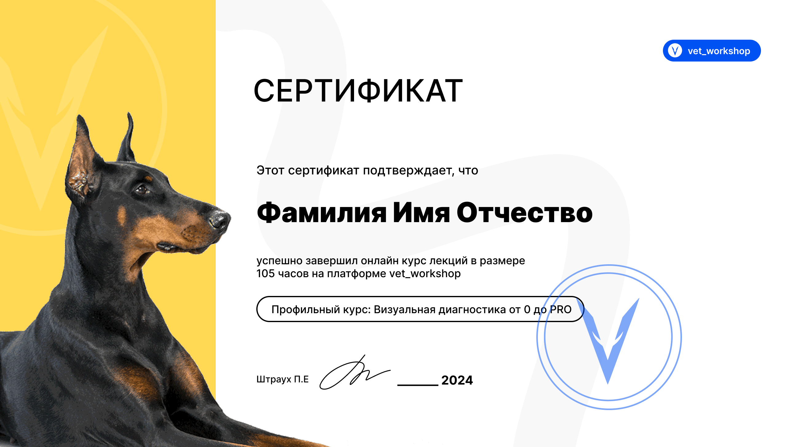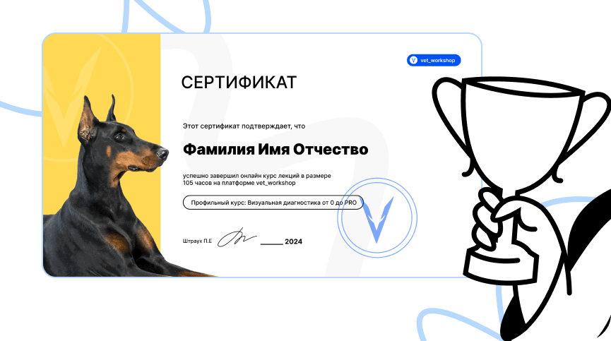 После завершения курса и успешного прохождения тестирования, вы получите электронный сертификат, подтверждающий успешное окончание курса "Ветеринарный врач визуальной диагностики", усвоение материала и успешное завершение обучения.